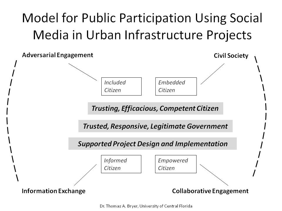 Though I have researched the use of social media by government for public participation, I have not before examined its use within the more narrow context of large-scale urban infrastructure projects. As I have found, neither has anyone else! I will thus be developing this into a broader study and already have data behind the model depicted above (though not fully discussed in the preliminary remarks). I welcome your thoughts.