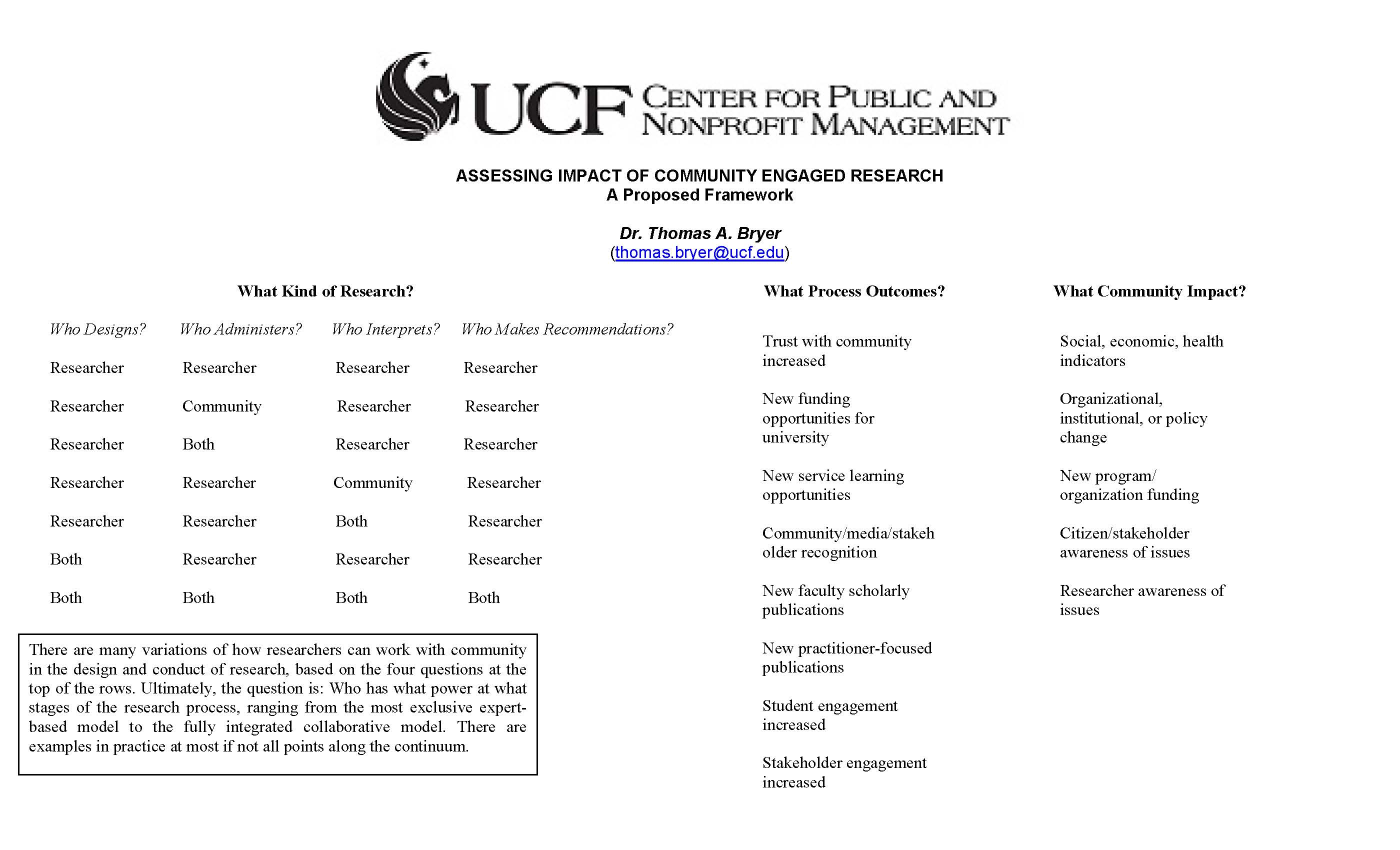 In the Center for Public and Nonprofit Management at the University of Central Florida, we strive to achieve impact through our research. To that end, I have developed a framework for assessing impact, along with process and outputs. What do you think? Have you seen other models?